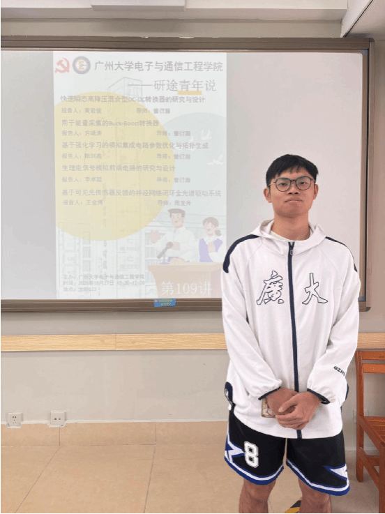 黄君俊同学介绍了一种先从目前混合型DC-DC的研究背景出发,介绍了混合型DC-DC目前主流的研究方向,以及研究方法。以开关电源领域的经典拓扑buck电路为例,围绕buck型DC-DC转换器的缺陷分析及其优化方法,特别针对高降压比应用场景(如12V转1V)进行了深入探讨。针对传统的buck电路进行缺陷分析,提出具体的优化方向。(降低开关应力,采用低压管减小导通阻抗等)为电源方向的同学提供了具体可以优化的四大方向,起到抛砖引玉的作用。