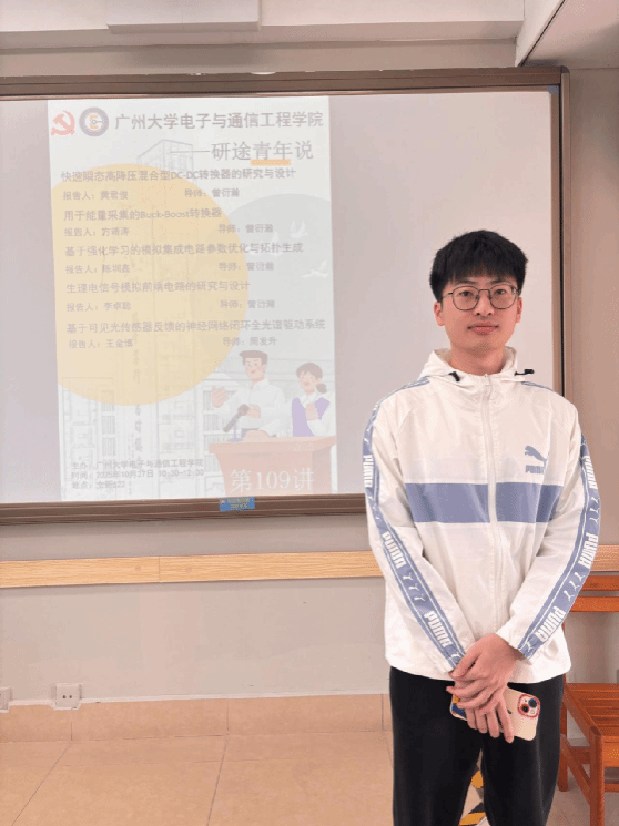 方靖涛同学介绍的主题是关于 “用于能量采集的 Buck-Boost 转换器” 的研究报告,按 “背景意义 - 研究现状 - 方法过程 - 结果应用 - 总结” 逻辑展开。背景上,传统 IoT 设备依赖可更换电池,存在寿命短、更换成本高问题,能量采集技术可实现自供电与高集成度,Buck-Boost 转换器是关键支撑;研究现状梳理了 2018-2023 年国内外成果,如成均馆大学的时域 MPPT 技术、上海交大的混合型 DC-DC 转换器等。研究中针对宽功率范围与高效率、多负载供电、精准零电流检测三大难点,设计含最大功率点追踪(环形振荡器定采样周期 + 静态比较器追踪)、多输出控制(DCM 模式单周期依次供电)、模拟 - 数字混合零电流检测器(模拟粗调 + 电容阵列数字细调)的转换器架构,目前已完成版图制作及后仿,进入流片阶段,仿真显示 EPSM 机制可应对负载能量不足、Csto 能降低输出纹波、H-ZCD 检测精度高,为能量采集系统高效供电提供了解决方案。
