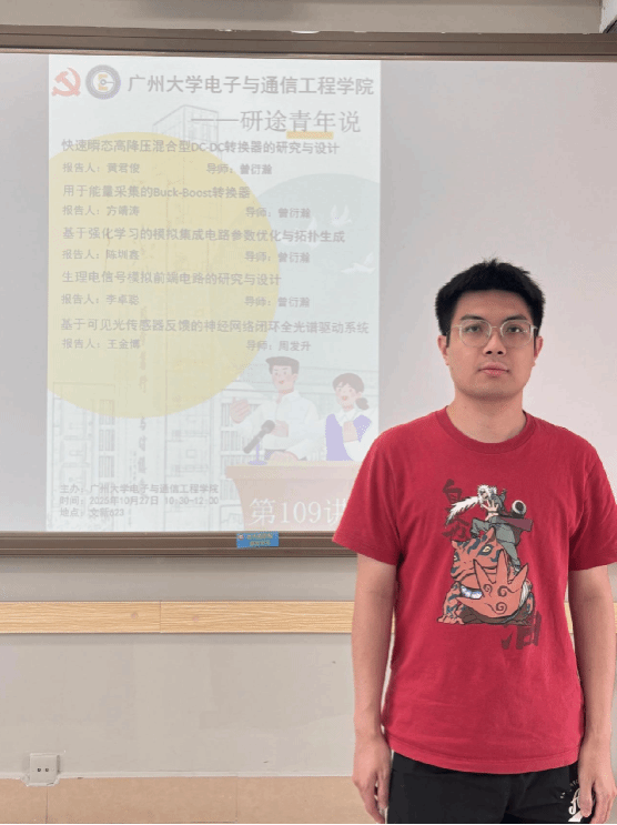 陈圳鑫同学介绍的主题是基于强化学习的模拟集成电路自动化设计,分为两部分:一是模拟集成电路的参数优化,通过图神经网络提取电路拓扑信息,结合强化学习算法,并引入瞬态断言技术,大幅减少瞬态仿真次数,断言准确率超 99%,实现增益、相位裕度等14项指标的全规格优化;二是模拟集成电路的拓扑生成,采用蒙特卡洛树搜索构建多层树结构,结合专家知识筛选(如检查短路、拓扑重复性,计算电压转化比和平均电感电流),自动生成可用拓扑。研究成果中,参数优化工作已收录ISCAS 2025,另有 SCI 期刊论文在投。
