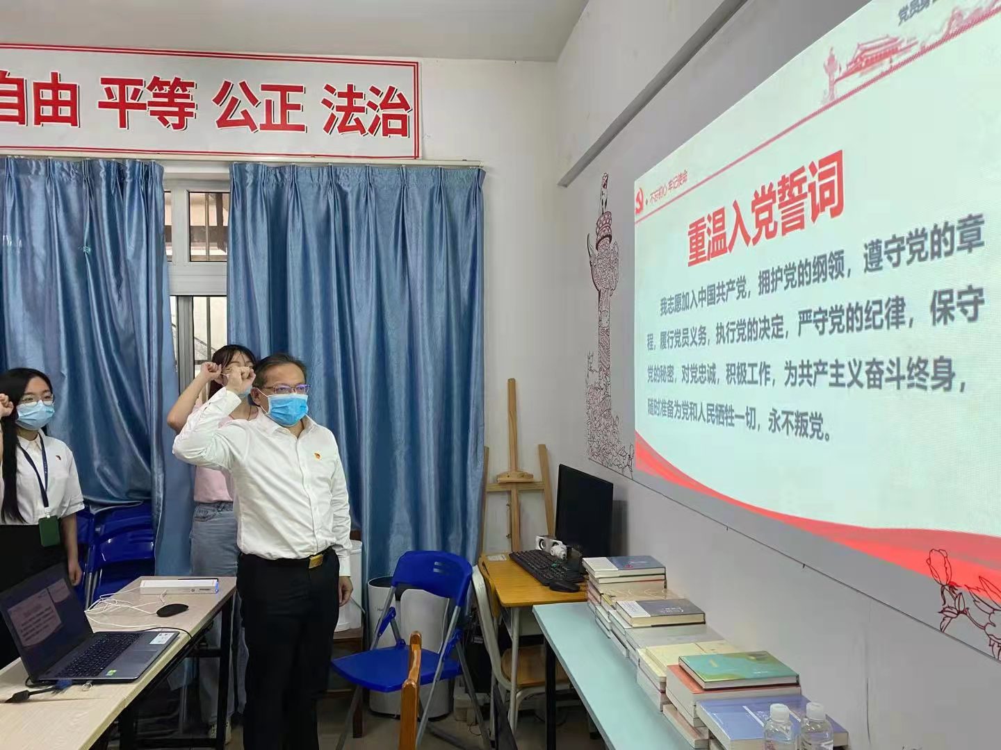 首先,陈泽龙书记带领全体党员重温入党誓词,再次接受了入党誓词的洗礼,体现了党员同志们对中国共产党的无线忠诚,坚定了入党使命,奋斗初心。