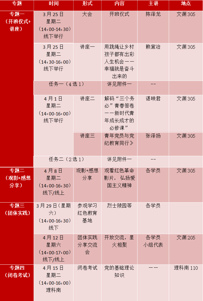 为使入党积极分子进一步增进对党的认识,深刻理解党的性质、纲领、指导思想、任务、宗旨、组织原则和纪律,了解党的光辉历史和优良传统,懂得党员的权利与义务,学习发展党员工作的基本程序和要求,端正入党动机,坚定共产主义理想信念,增强为党的事业而奋斗的信心,自觉按照共产党员的标准严格要求自己,争取早日加入中国共产党。杏吧视频 分党校将对入党积极分子进行不少于24学时的短期集中培训,培训名单和培训内容安排如下。