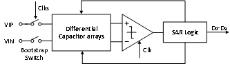 论文所考虑的低功耗逐次逼近型模数转换器电路如下图所示,随着电源电压的下降,模数转换器的功耗进一步降低,但是采样开关的线性度,比较器的精度、噪声以及失调等非理想因素,都会对模数转换器的信噪比等动态性能产生影响,从而恶化模数转换器的转换准确率。因此,论文对采样开关衬底漏电造成的非线性,低压条件下动态比较器失调以及噪声等问题进行研究,提出相应的改进电路并进行验证。