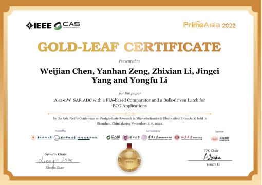 2020级集成电路工程专业研究生陈伟坚同学在2022年亚太地区微电子与电子研究生研讨会(The Asia Pacific Conference on Postgraduate Research in Microelectronics & Electronics,简称PrimeAsia 2022)所投递的论文成果“A 41-nW SAR ADC with a FIA-based Comparator and a Bulk-driven Latch for ECG Applications” 被评为“金叶奖”(GOLD Leaf Certificate)。